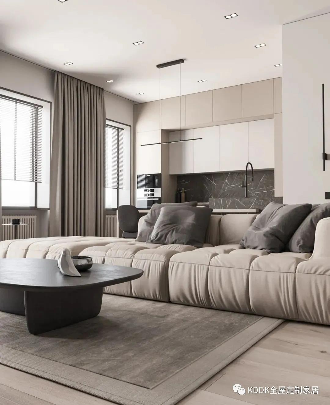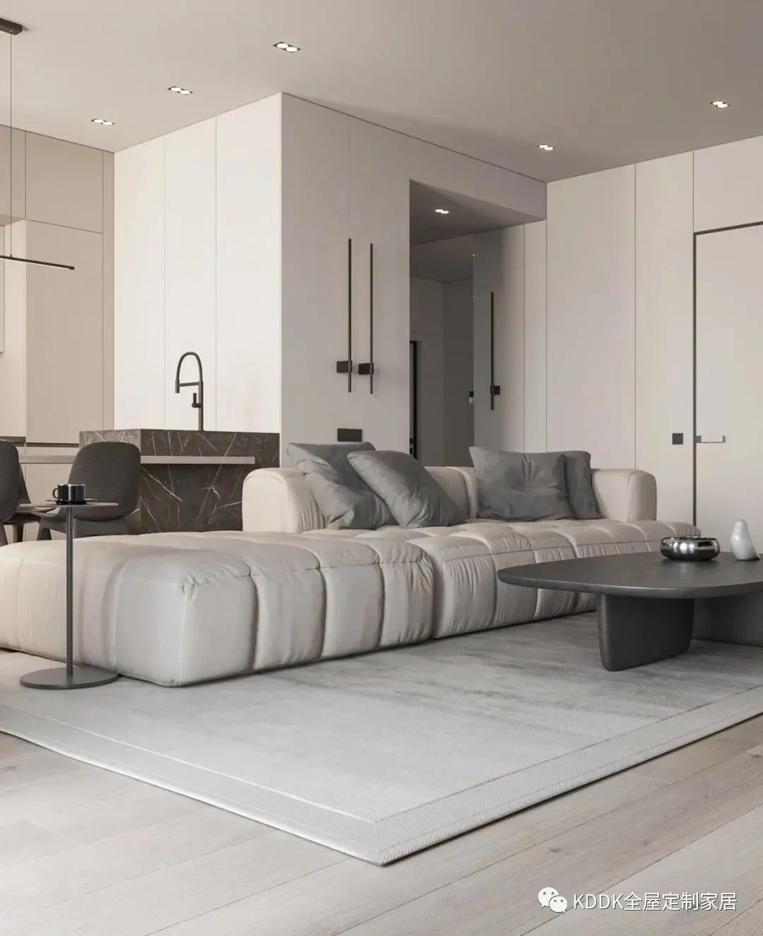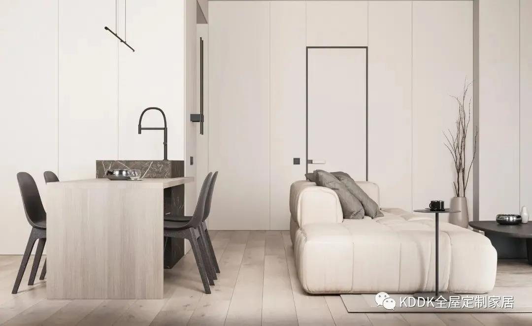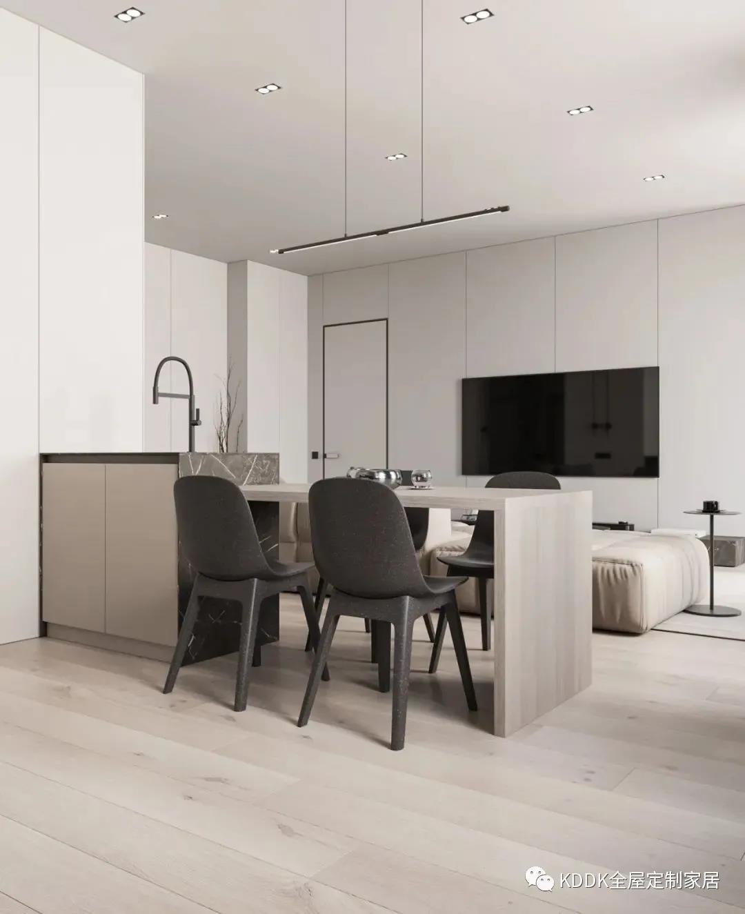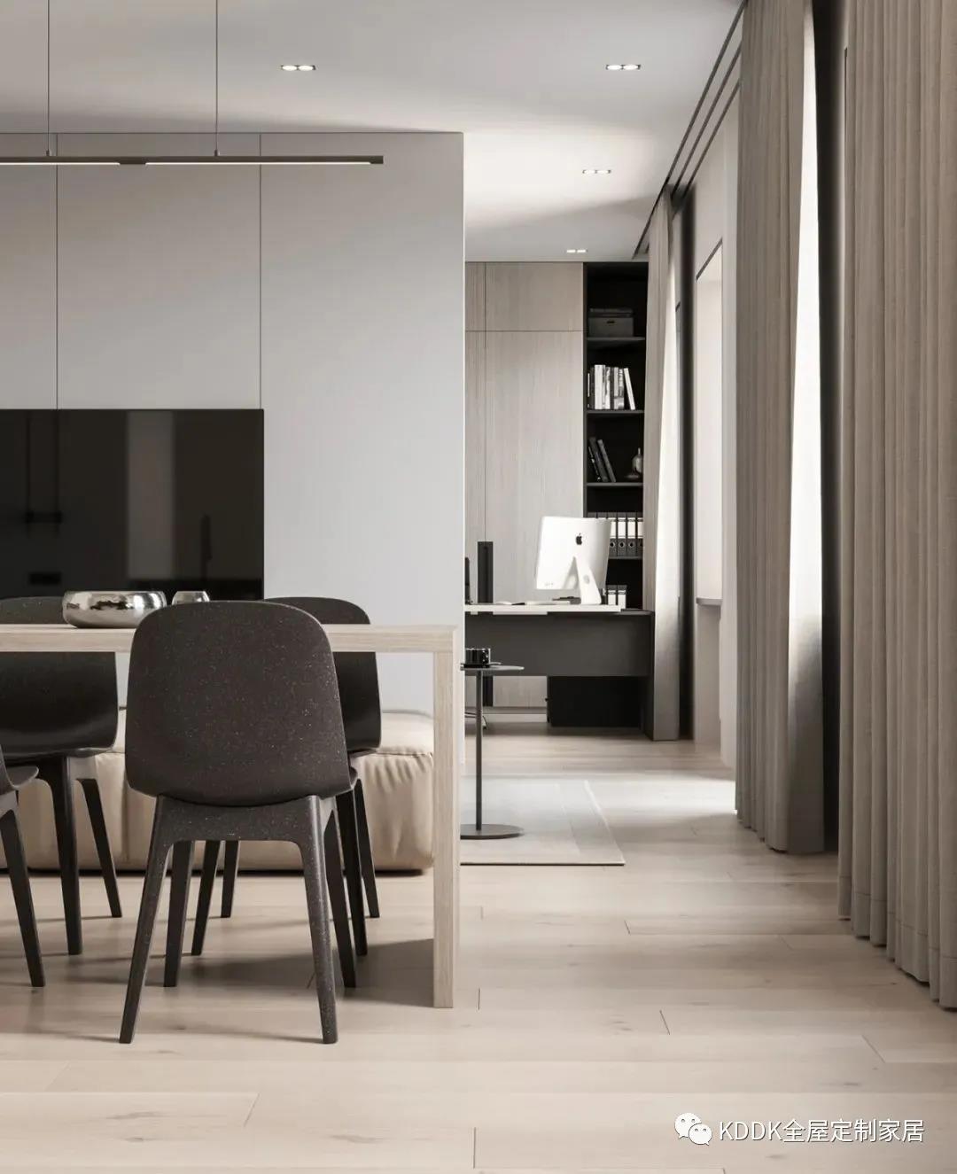开放式客餐厅一体化,大落地窗将充足的阳光带入房间,设计师用极简的线条来彰显空间的柔和、温暖,呈现了一个淡雅、奢华的静谧空间。