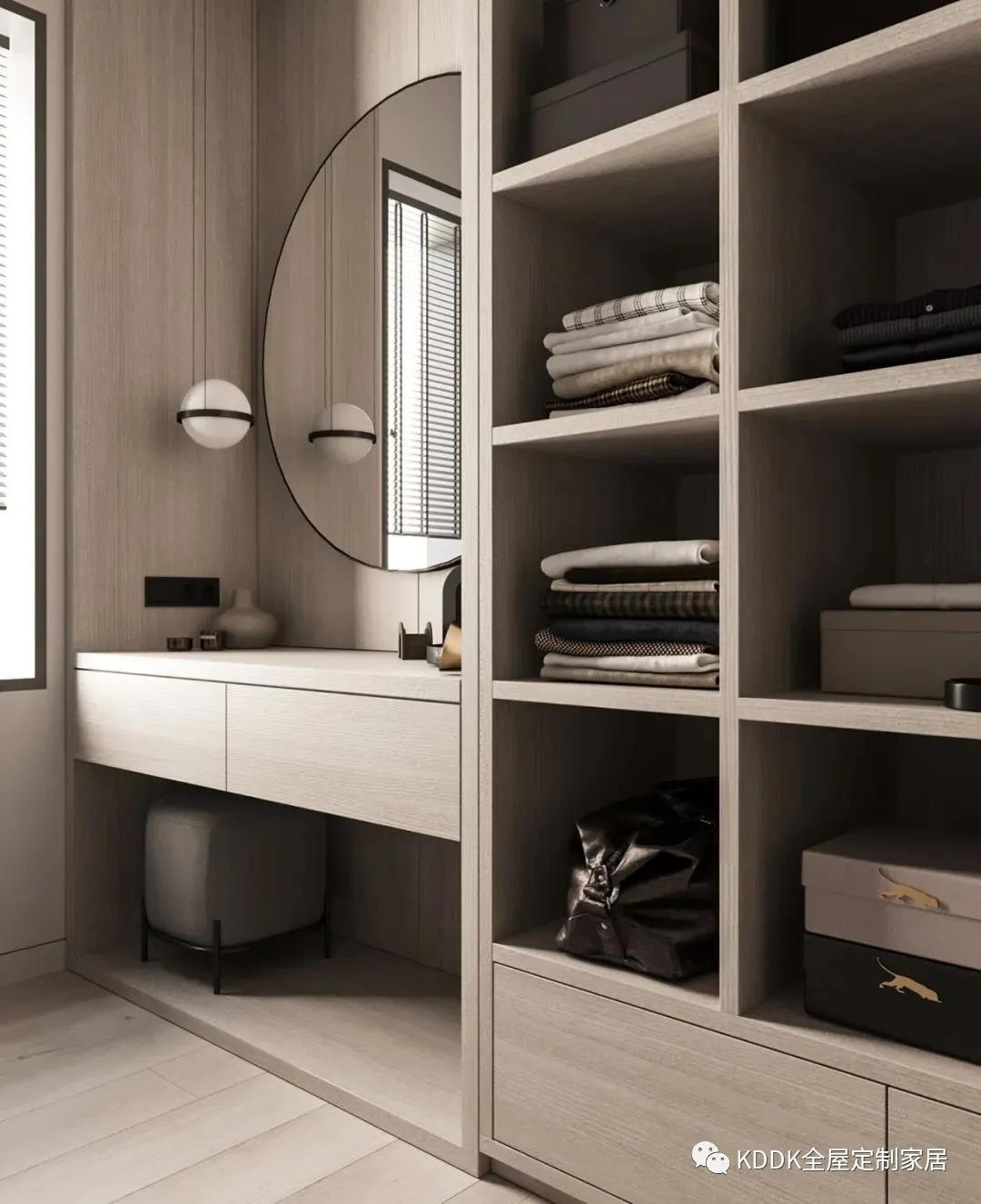 收纳区域非常干净整洁,层次分明,又满足业主的需求,体现了每一个细节恰到好处设计。卫生间的黑色元素彰显稳重、平衡的家居设计的质感,恰到好处地与木色相融合。