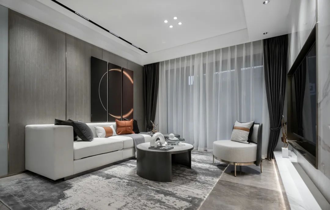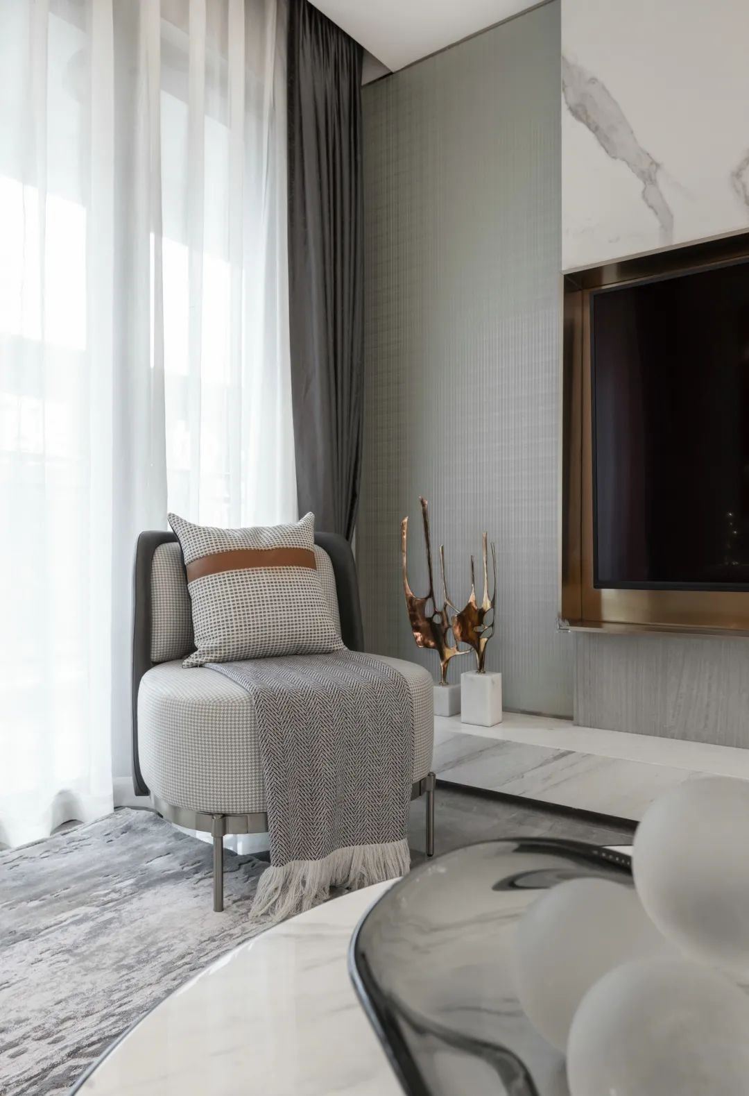 ▲现代艺术感满满的细节摆饰,布置在简洁明亮的客厅里,营造出一种淡雅舒适的舒适体验。