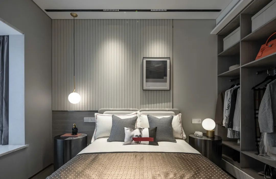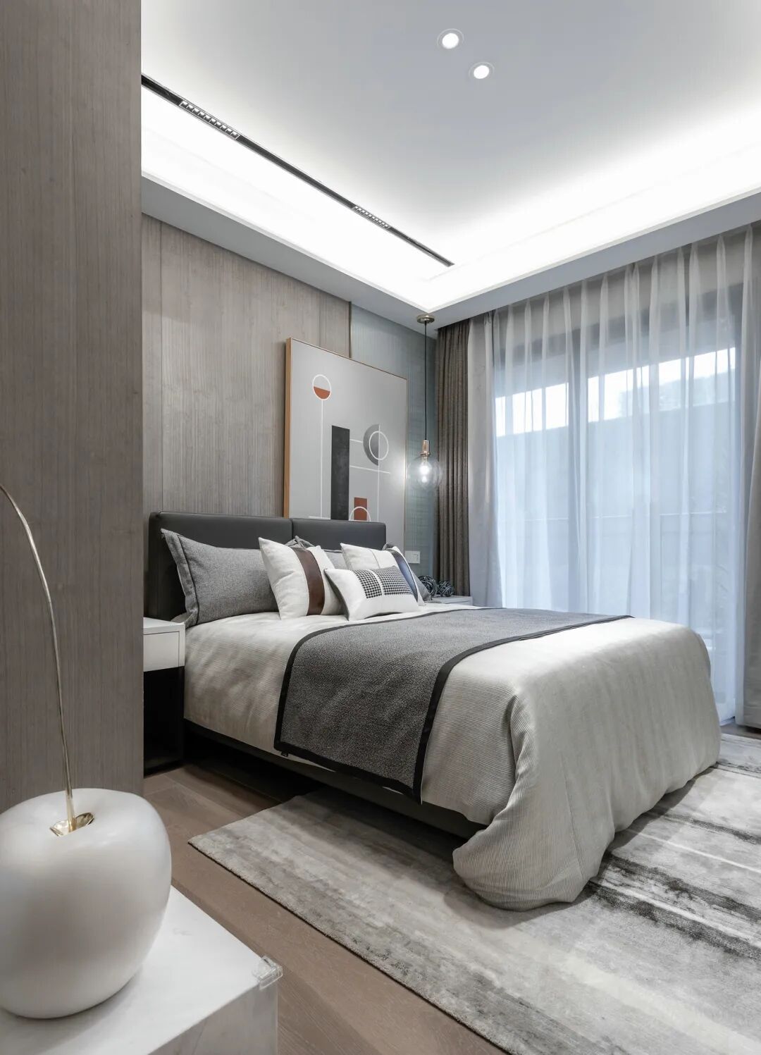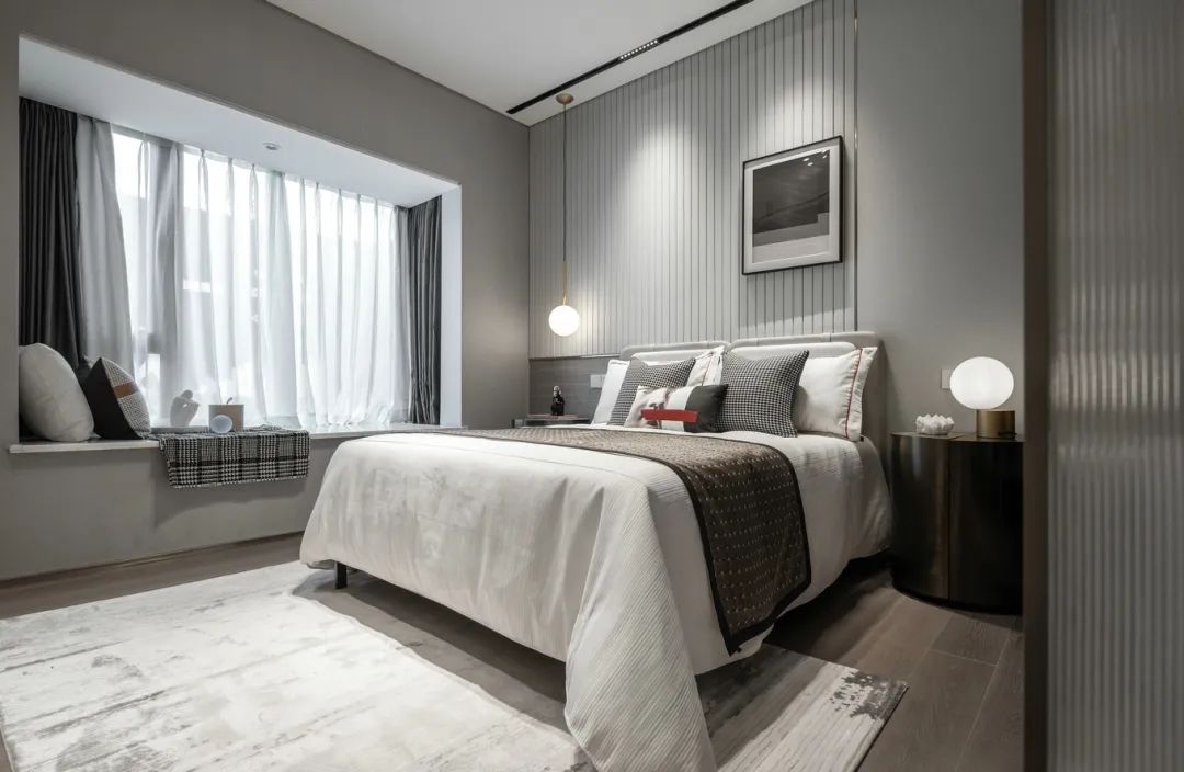 ▲卧室床头墙的木饰面与硬包组合,挂一幅轻奢风的装饰画,布置一张灰色皮艺床与灰色床单,地面还有一席灰色地毯,整个卧室显得现代舒适而从容档次。