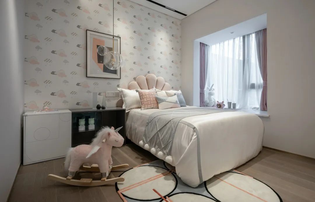 ▲儿童房的床头墙加入可爱的云团图案壁纸,布置皮艺床,床尾一块圆形地毯,摆上一个粉色小木马,让儿童房充满可爱的童趣感。