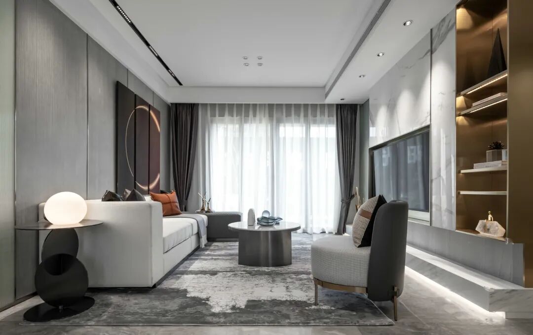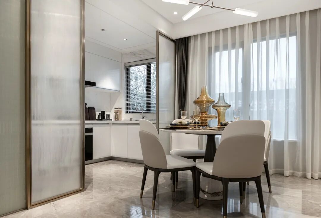 ▲现代风的质感与设计,贯穿着过道与客餐厅区域,金属与石材质感的加入,让空间显得格外的优雅高级。