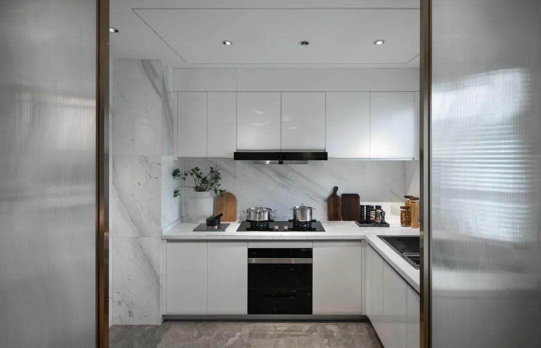 ▲厨房地面保持与客餐厅一致的质感,墙面加入雅白的墙砖,装上白色的定制橱柜,让做饭空间也干净优雅而情趣。