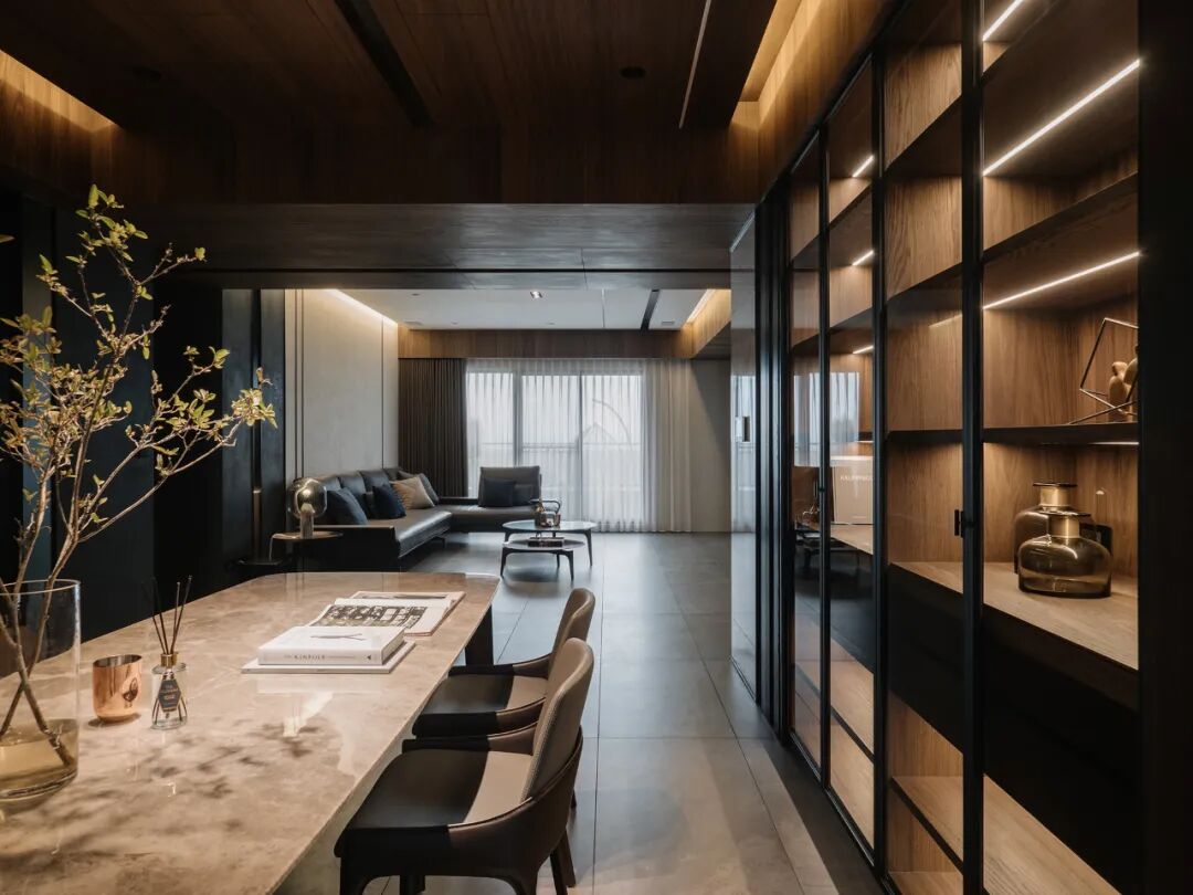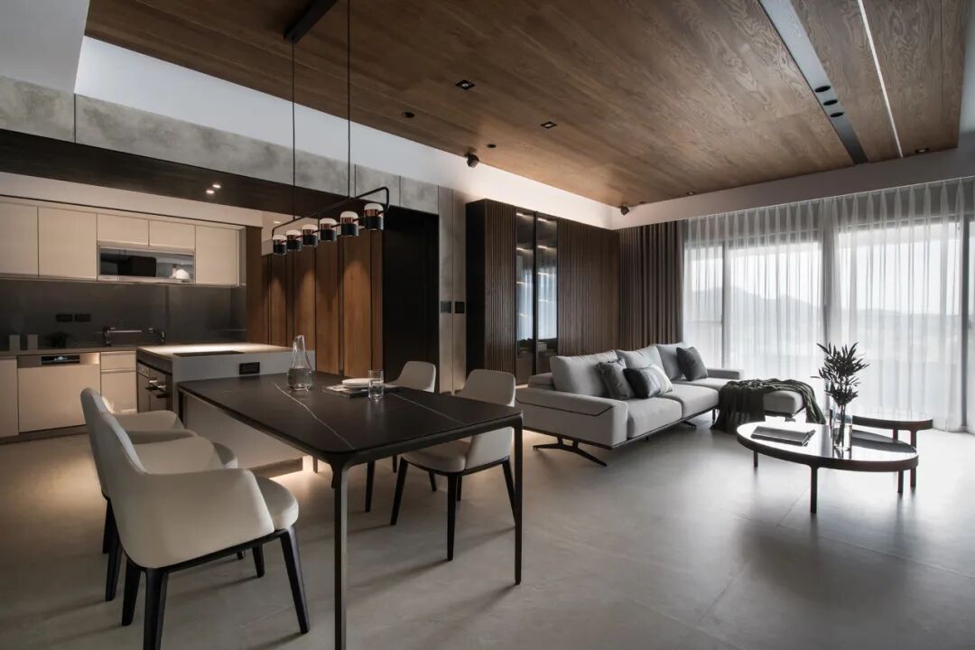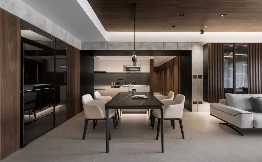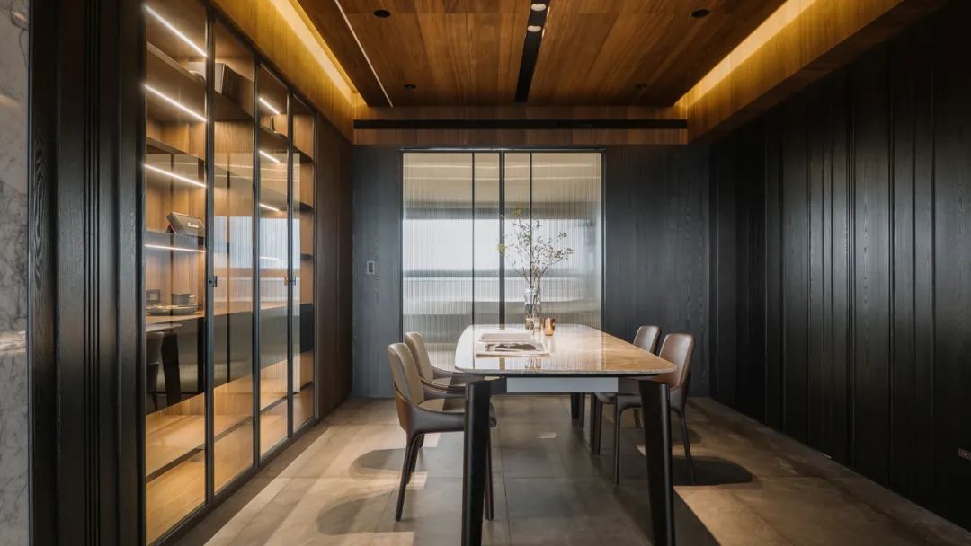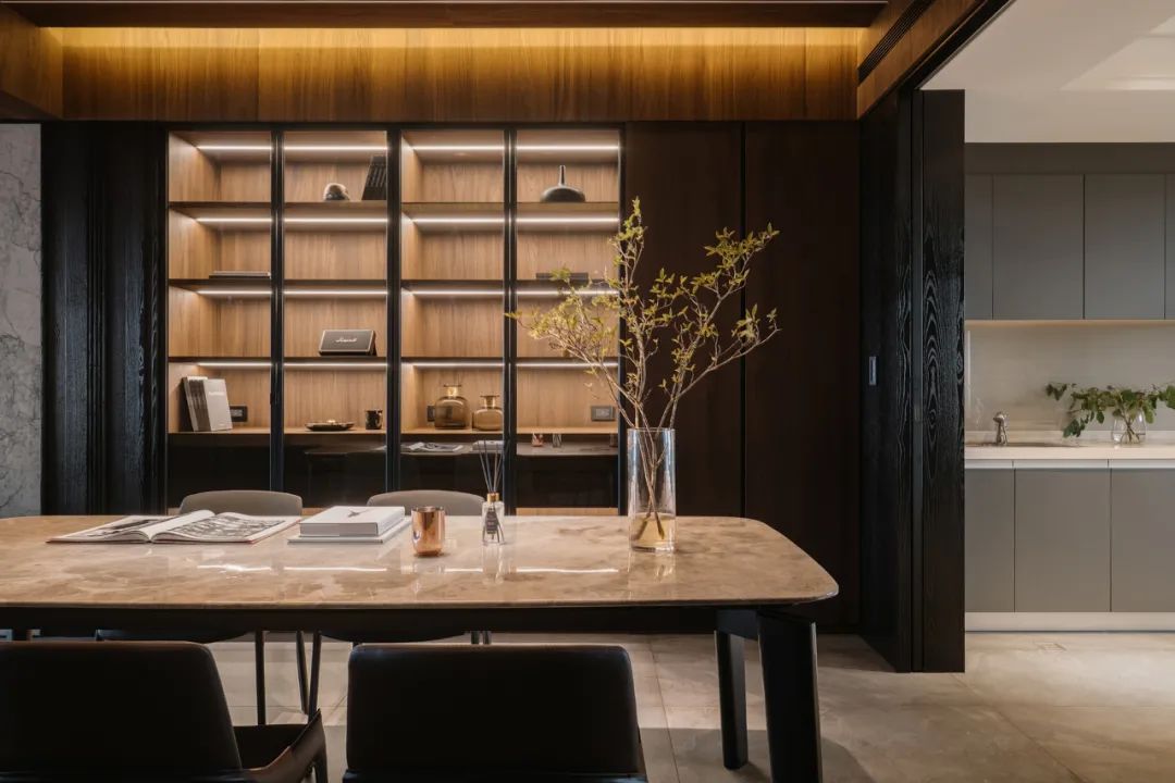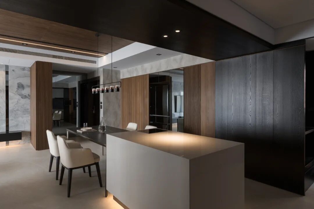 半透木皮与厨房空间交汇,高级的暗色调与丰富的触感,悄然间让空间氛围如涟漪般惊艳四起,导台与餐桌链接,打破了平静的局面,将精英贵族的高级感演绎得淋漓尽致。