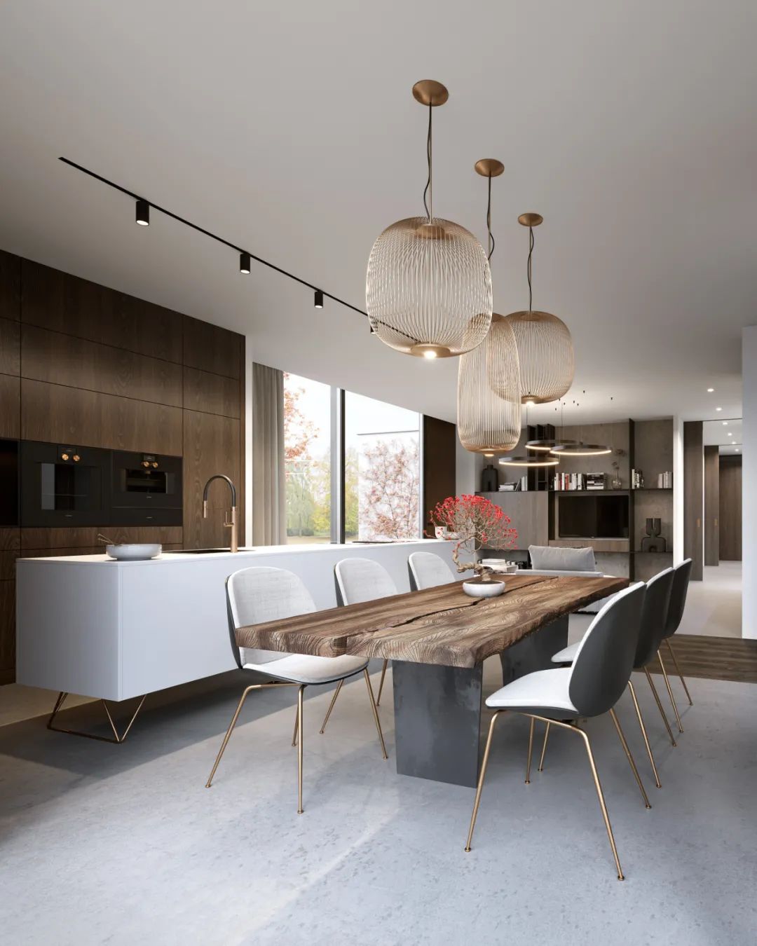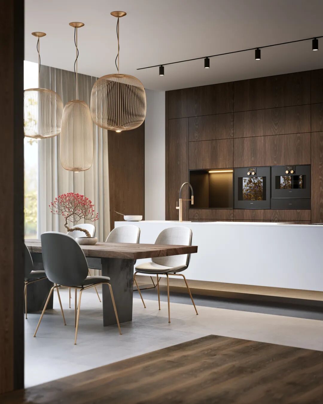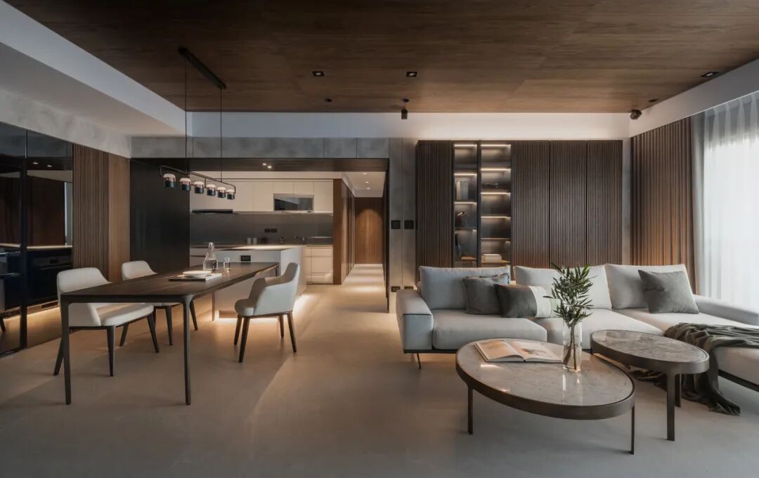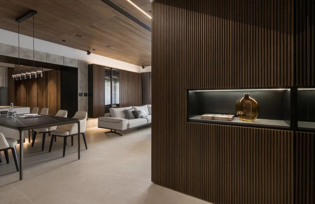 半透木皮与厨房空间交汇,高级的暗色调与丰富的触感,悄然间让空间氛围如涟漪般惊艳四起,导台与餐桌链接,打破了平静的局面,将精英贵族的高级感演绎得淋漓尽致。