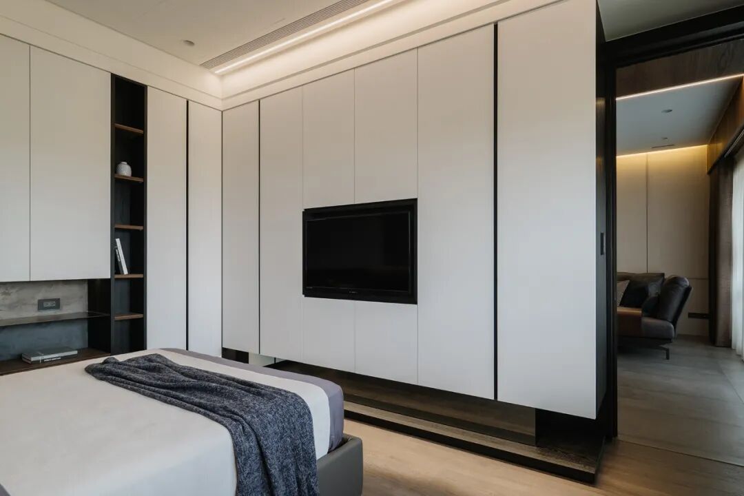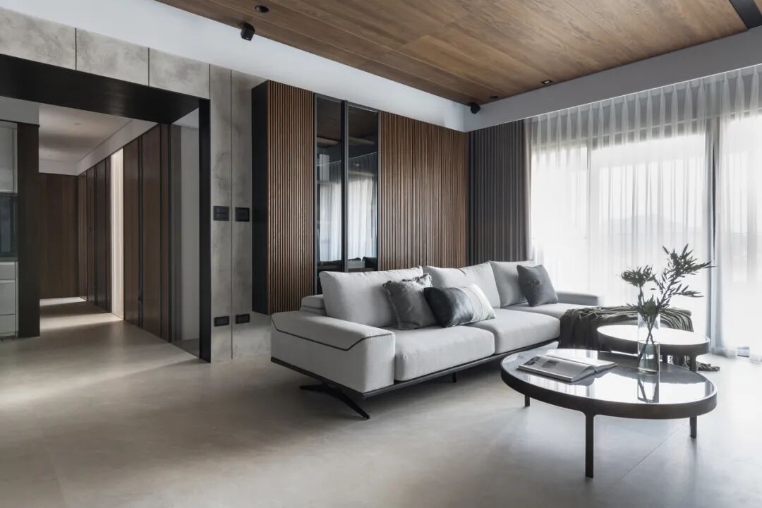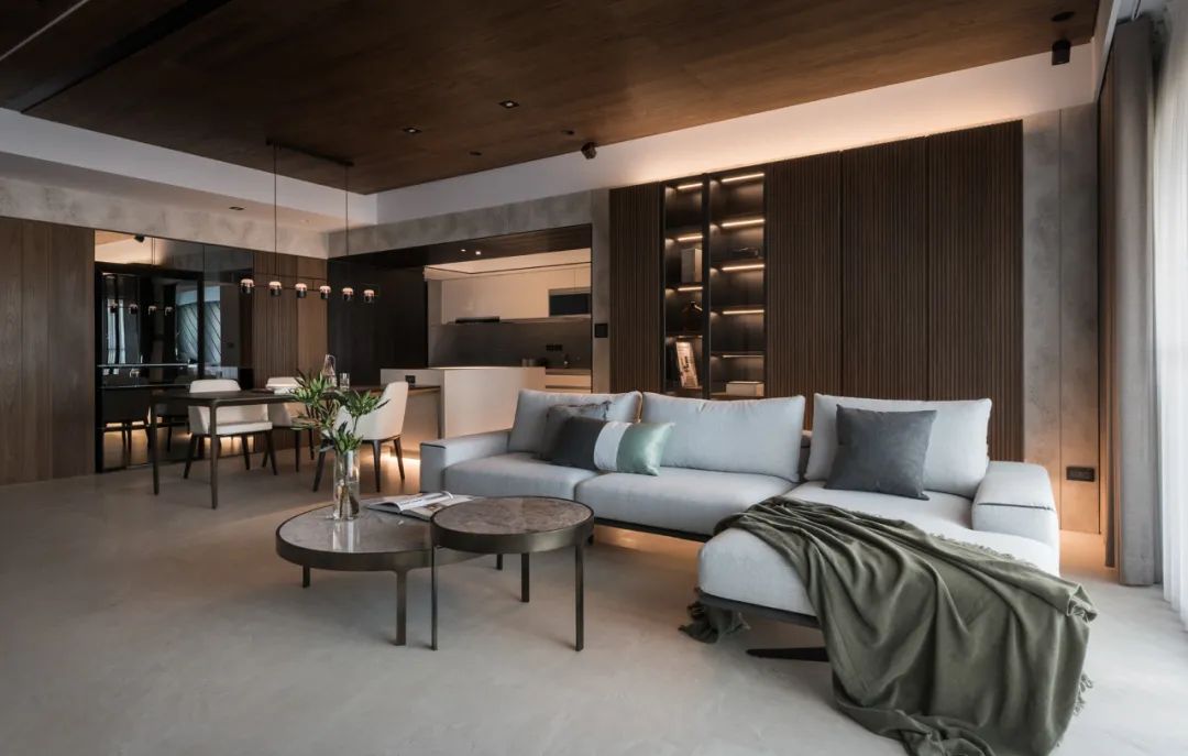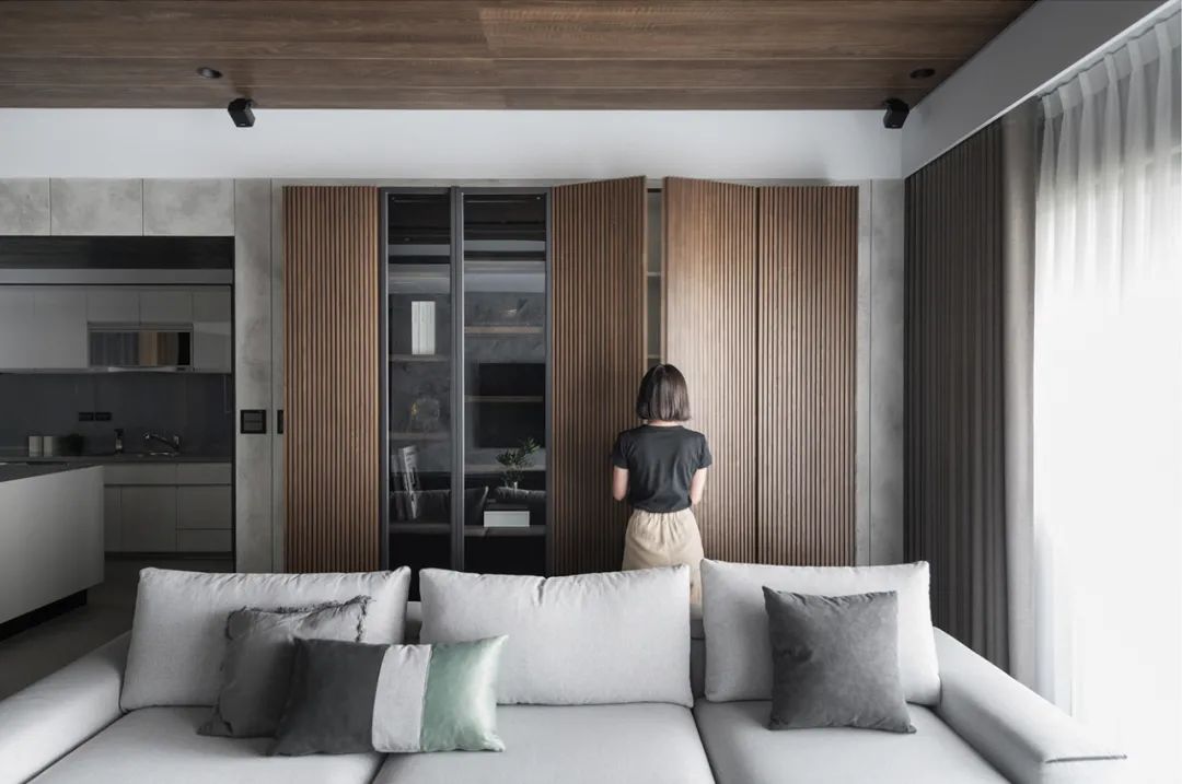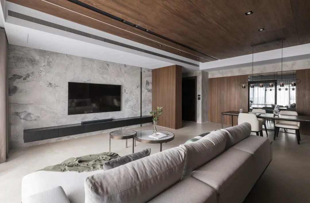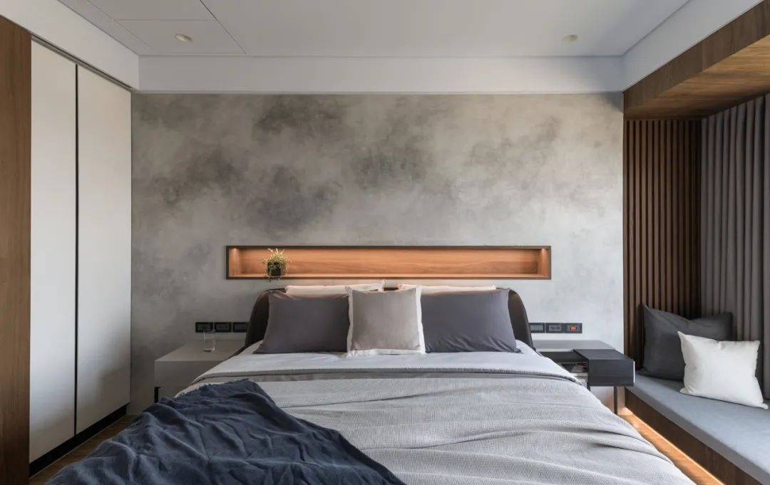 一镜到底的空间内,以木皮做基材,天花板与护墙及柜体,大面积的连贯铺盖,串联起一套完整而统一的高定系统,与高级灰融合,温馨感足倍递增。