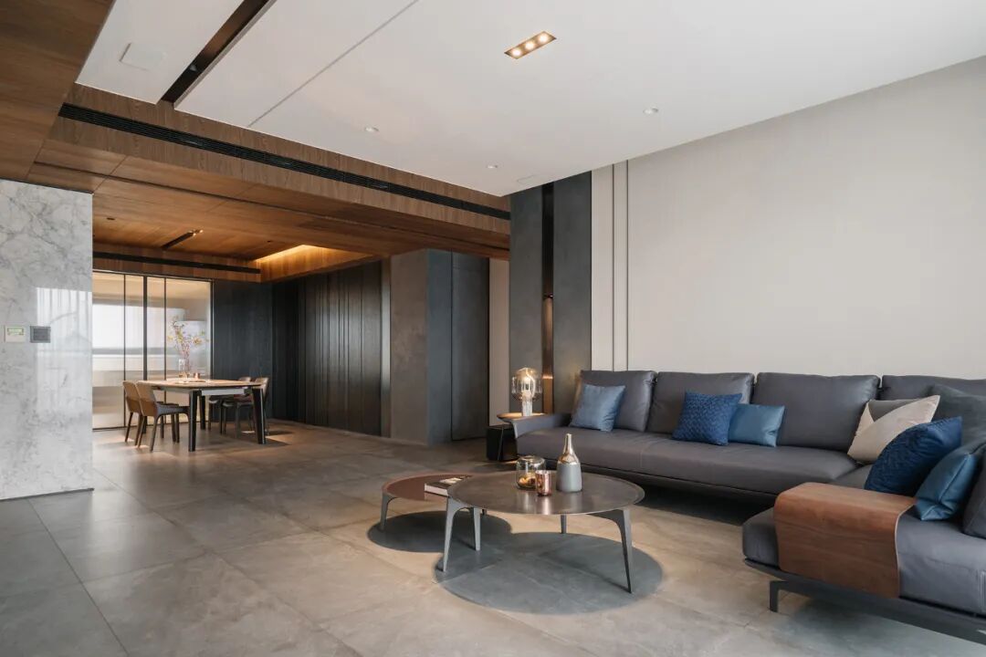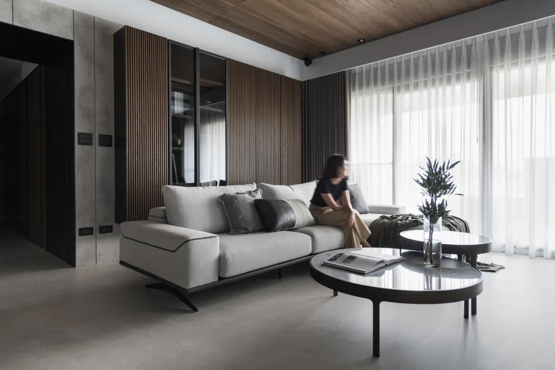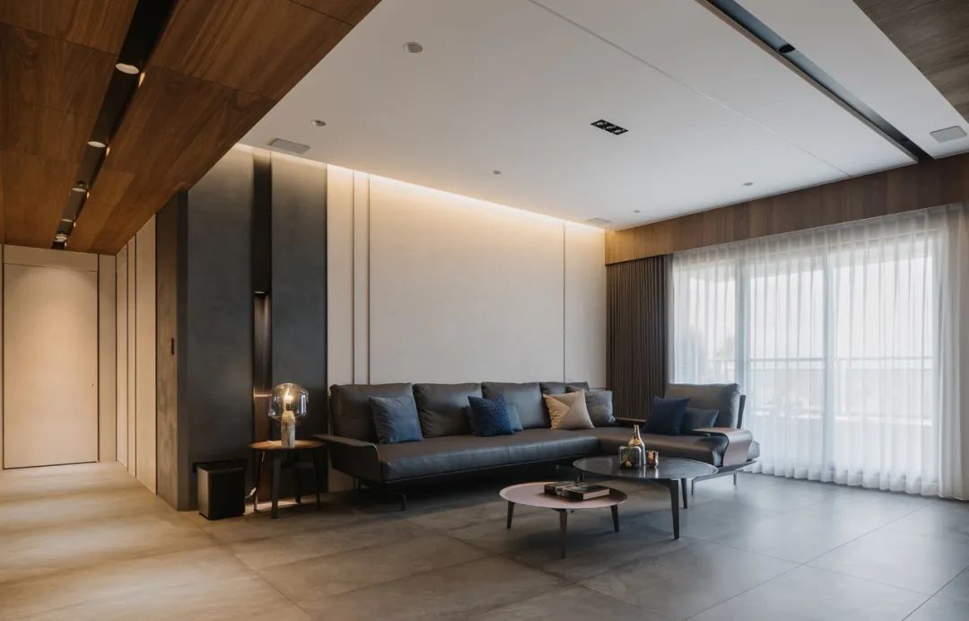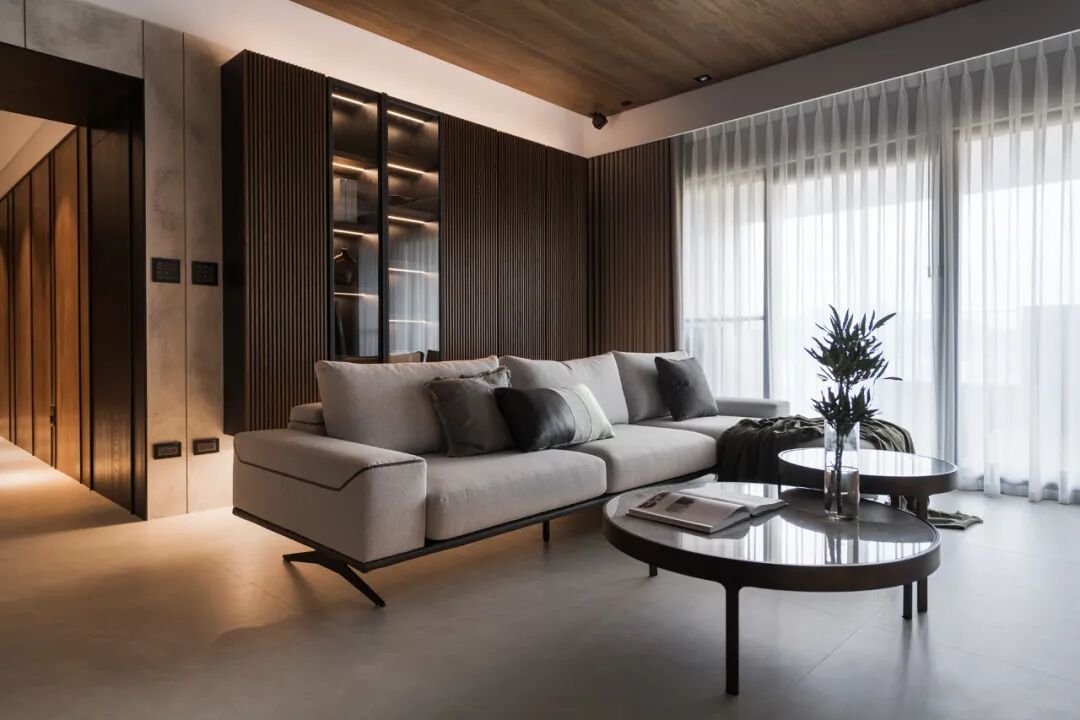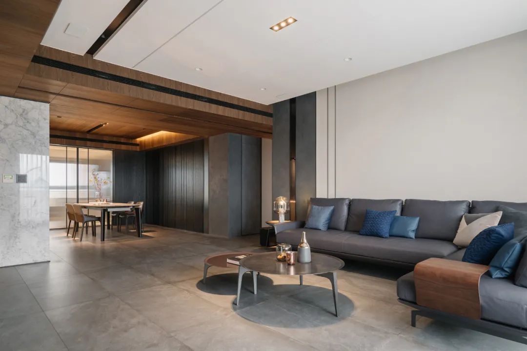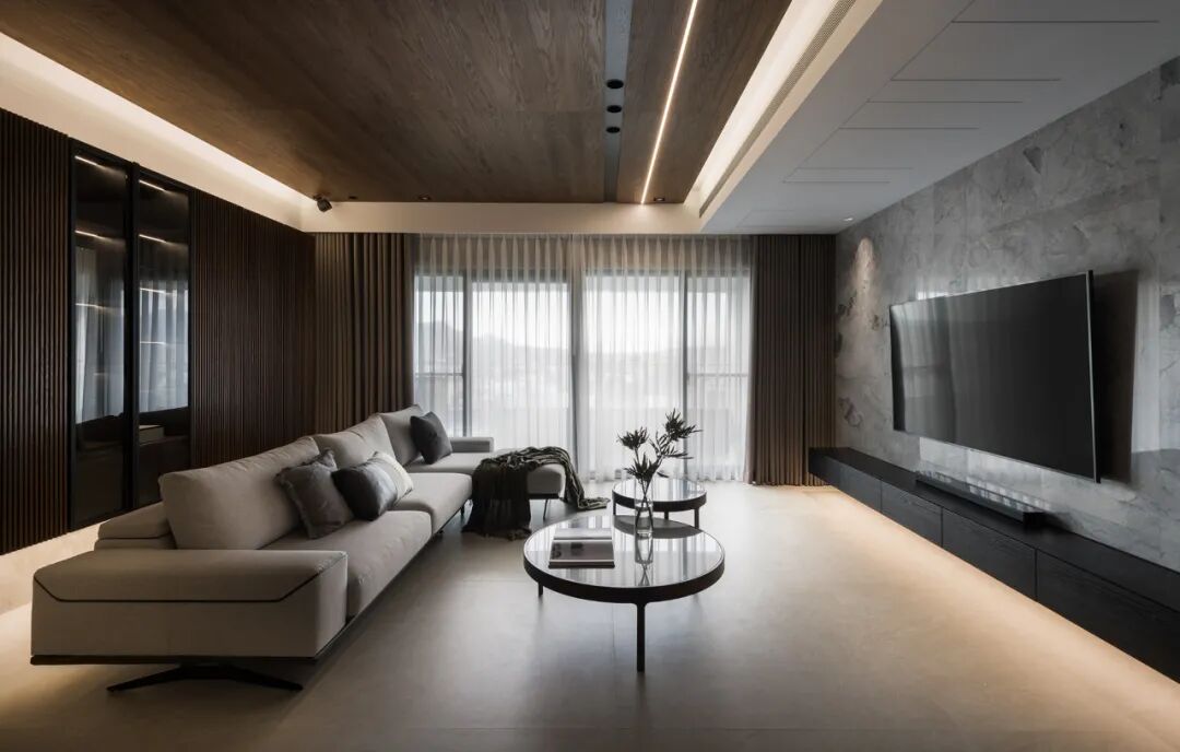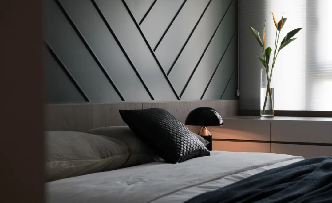 一镜到底的空间内,以木皮做基材,天花板与护墙及柜体,大面积的连贯铺盖,串联起一套完整而统一的高定系统,与高级灰融合,温馨感足倍递增。