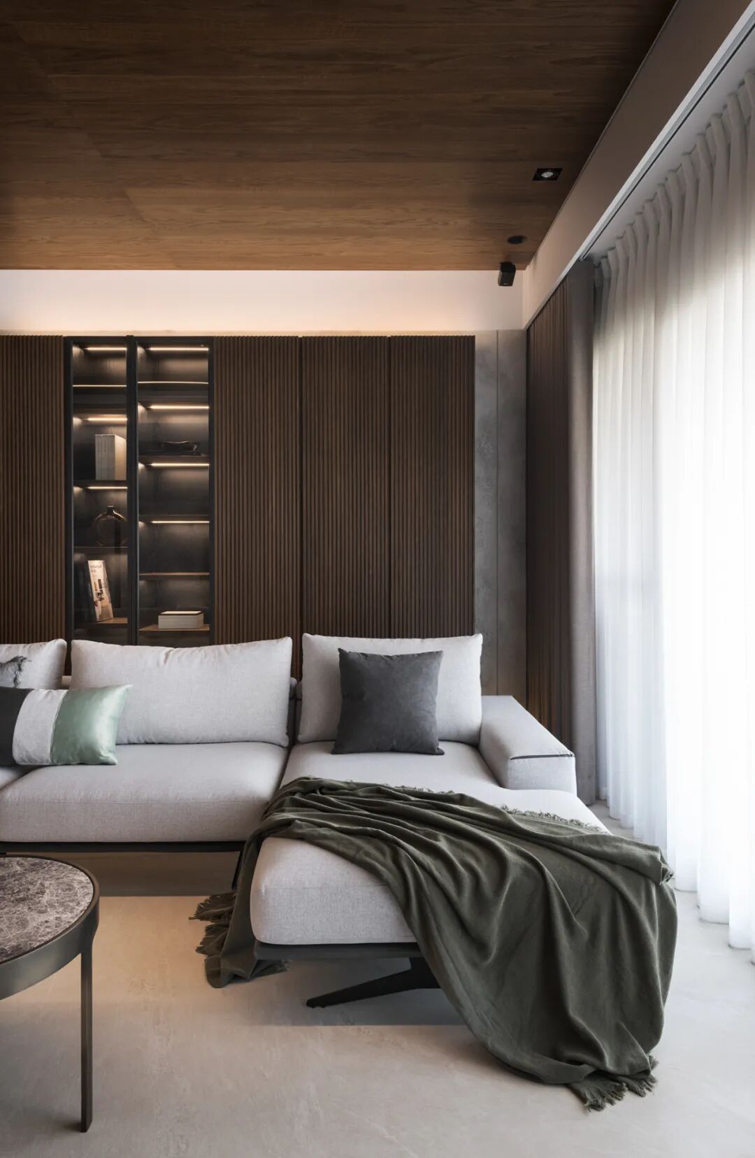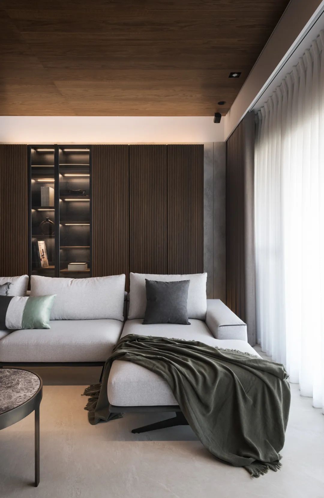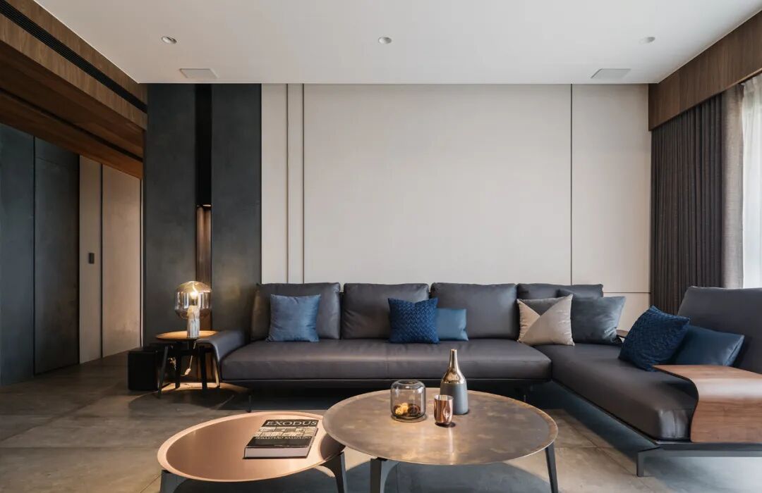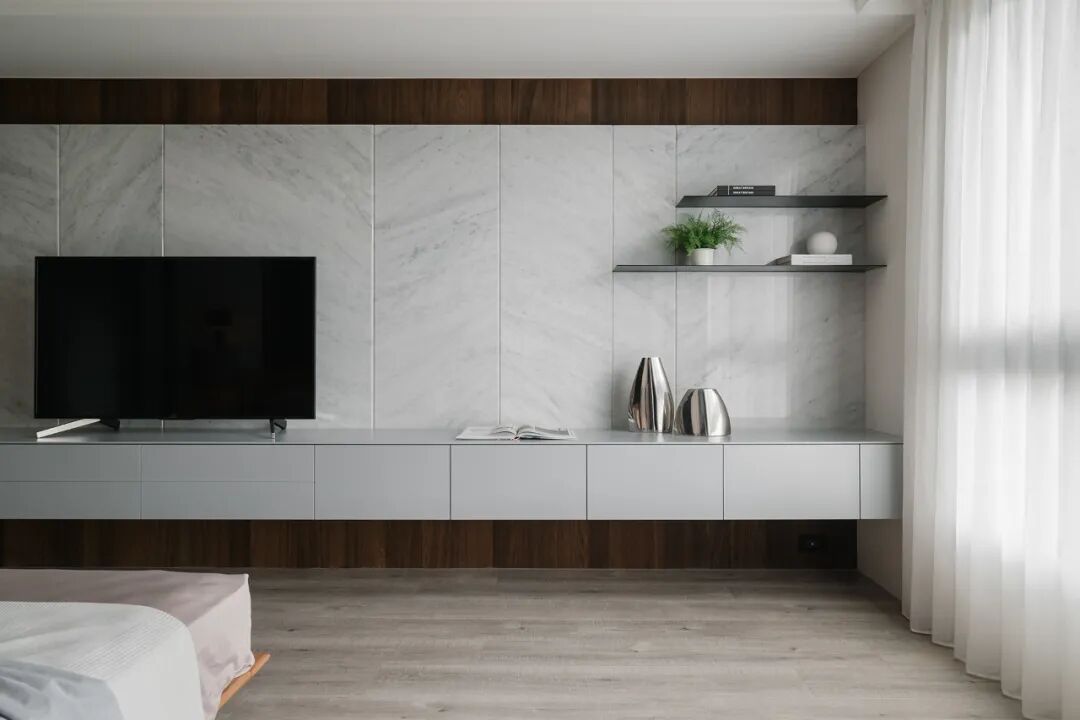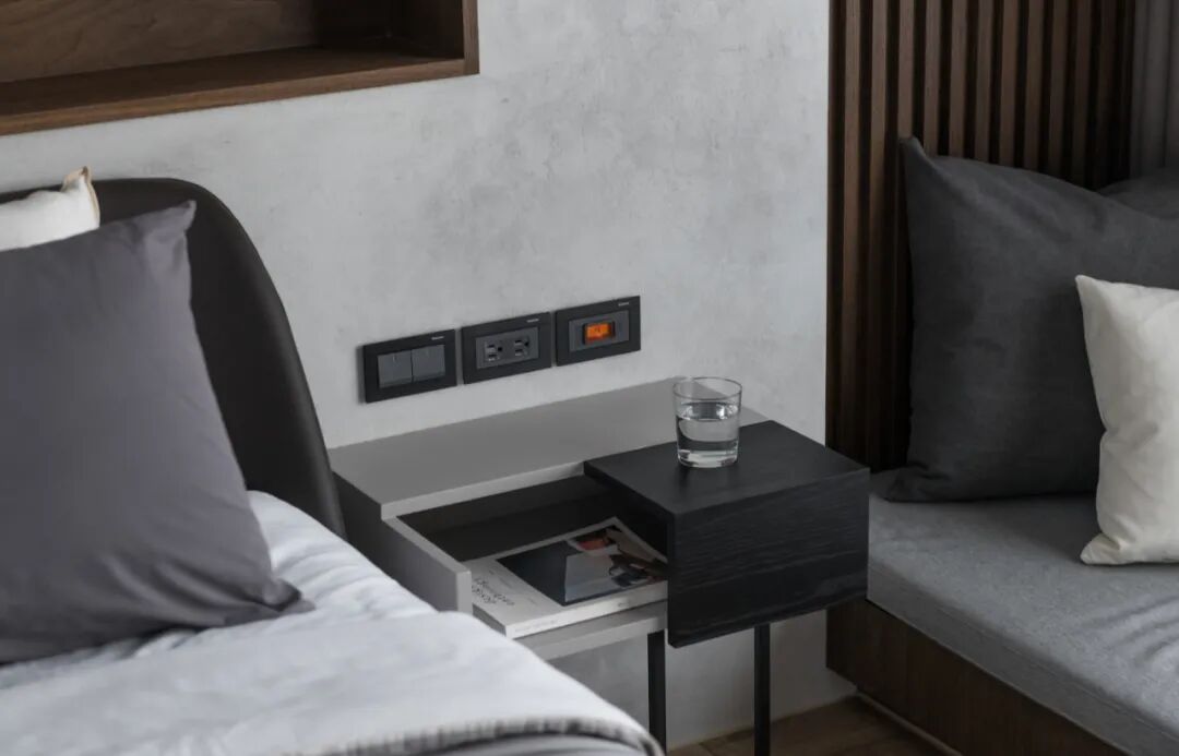 一镜到底的空间内,以木皮做基材,天花板与护墙及柜体,大面积的连贯铺盖,串联起一套完整而统一的高定系统,与高级灰融合,温馨感足倍递增。