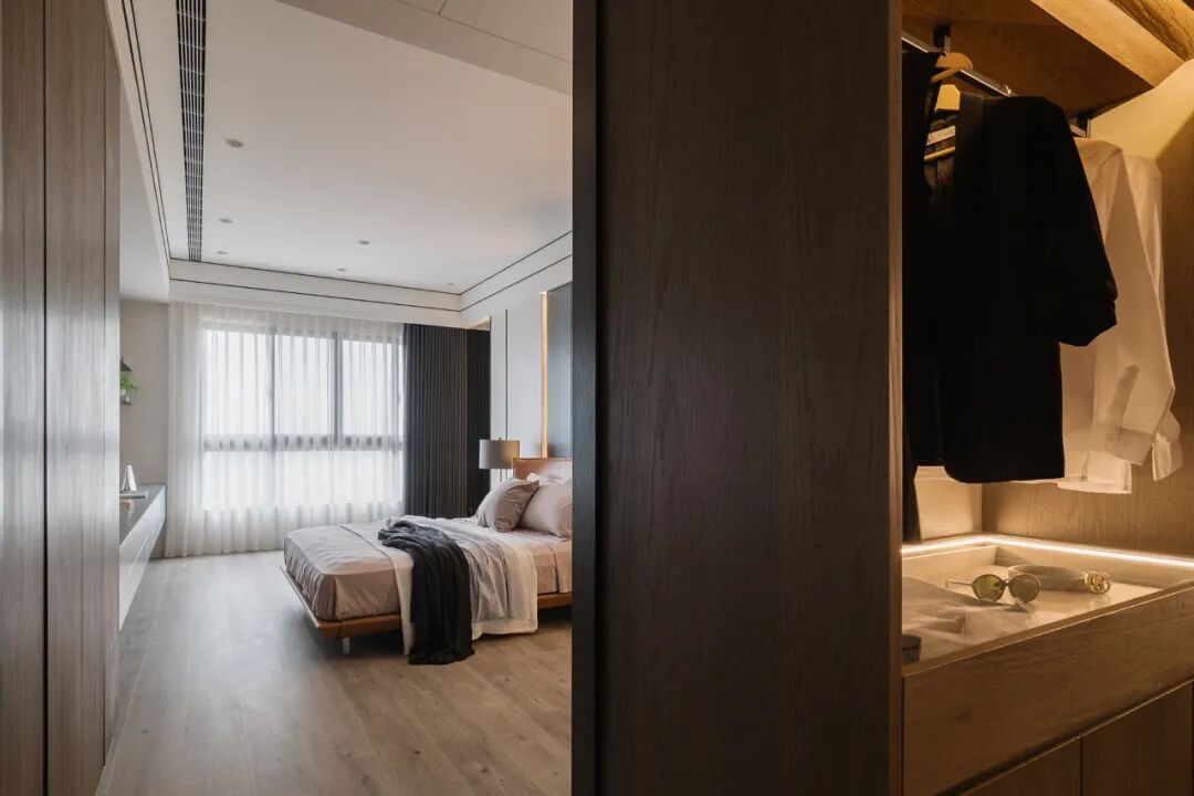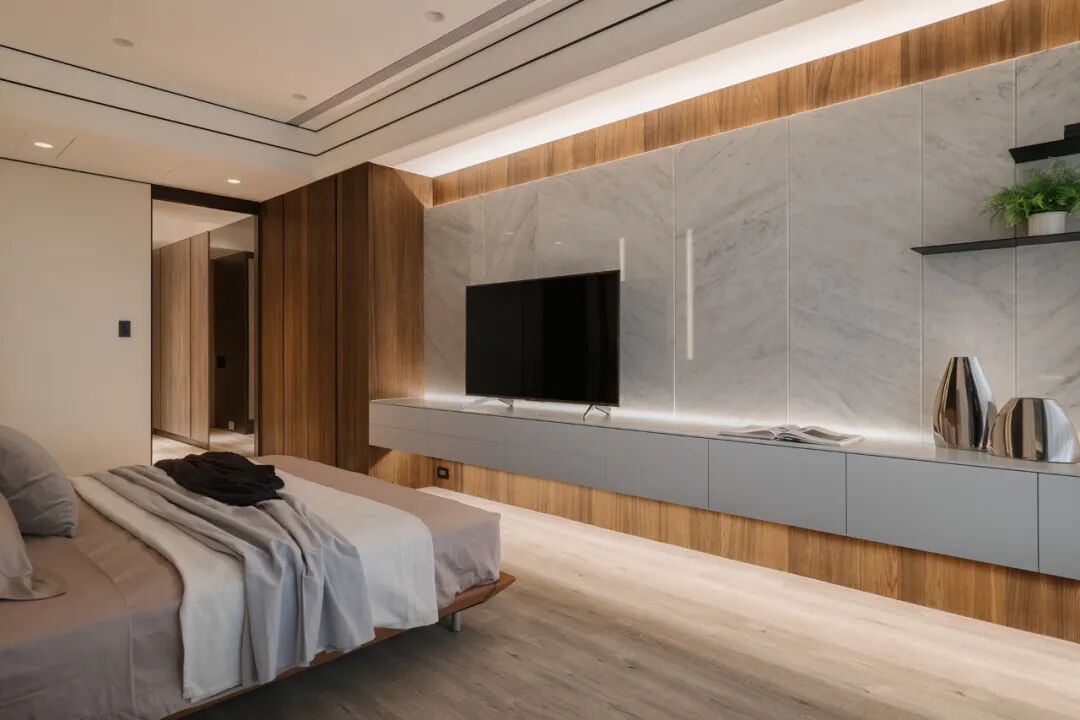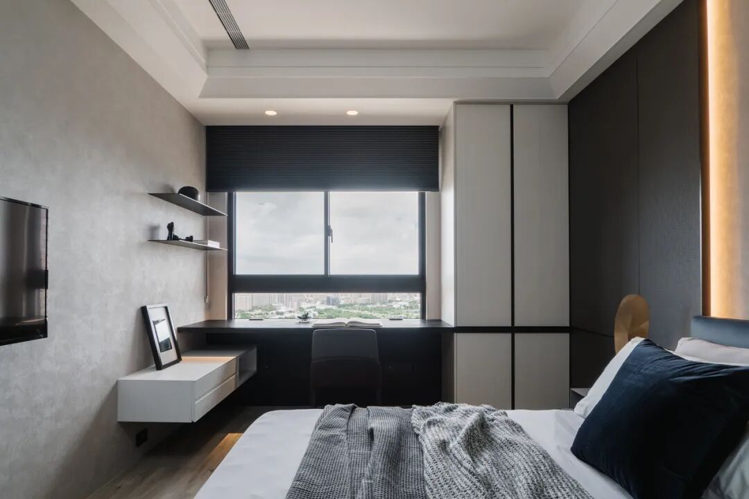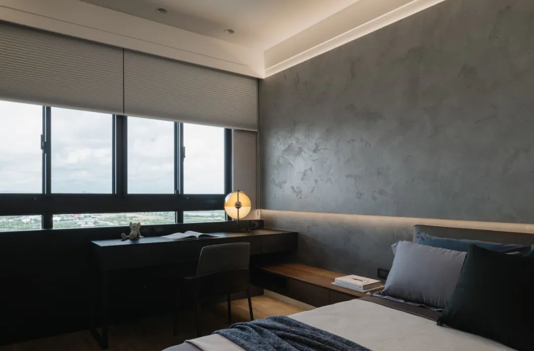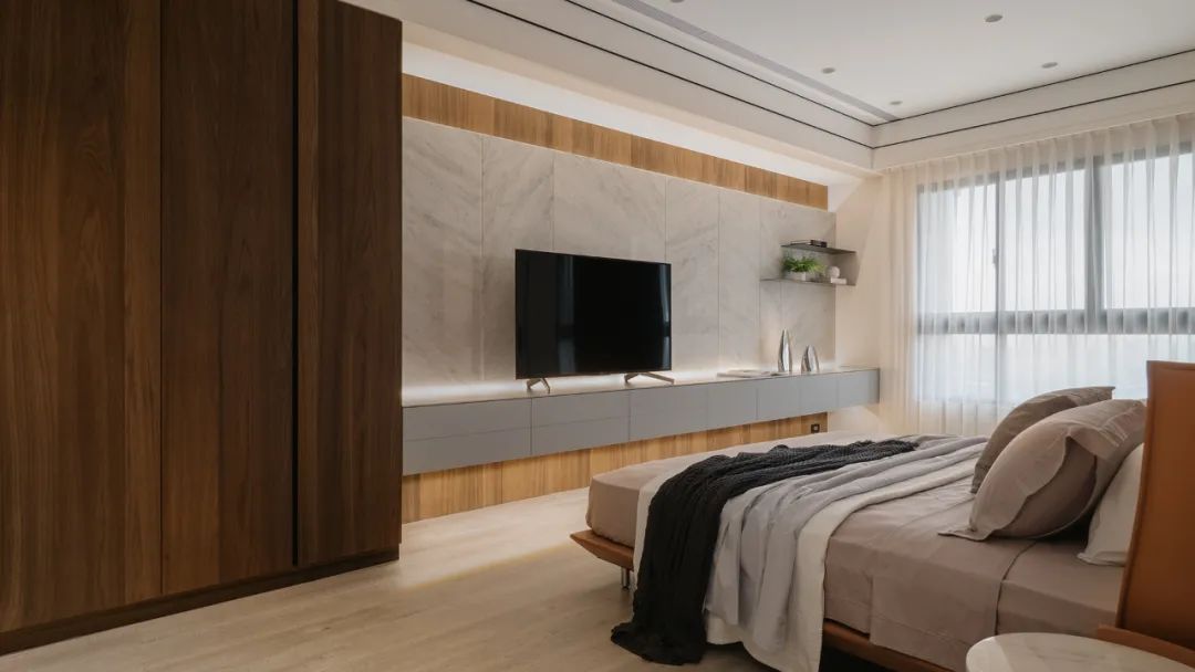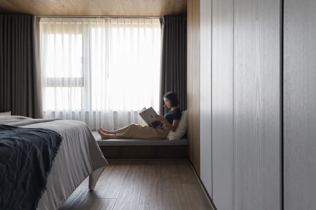 移步卧室,木皮沿着空间轨迹延伸,开启了空间与自然生态的对话,贴合墙面的定制设计,打破了单一化的空间视觉形态,飘窗、衣柜、书桌、墙柜等,展现出强大的多功能系统。