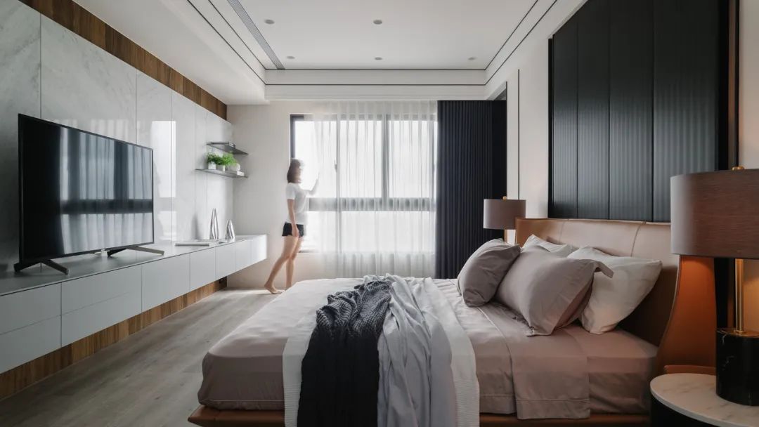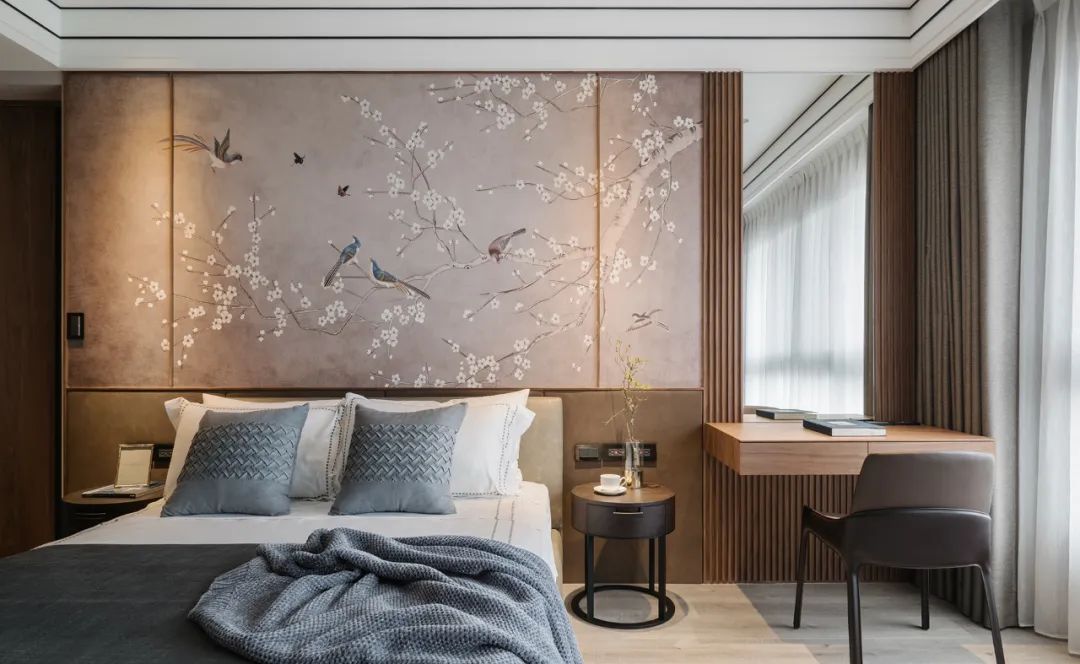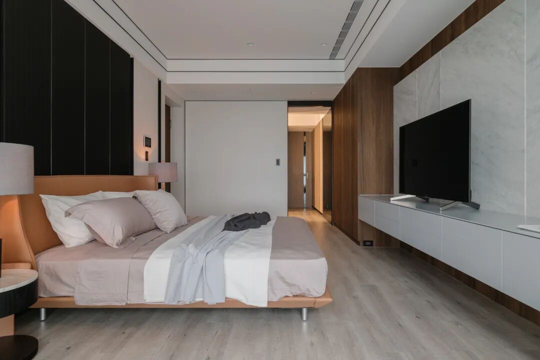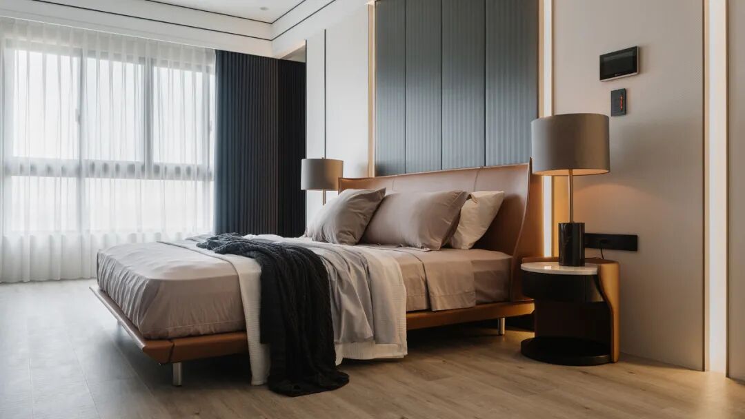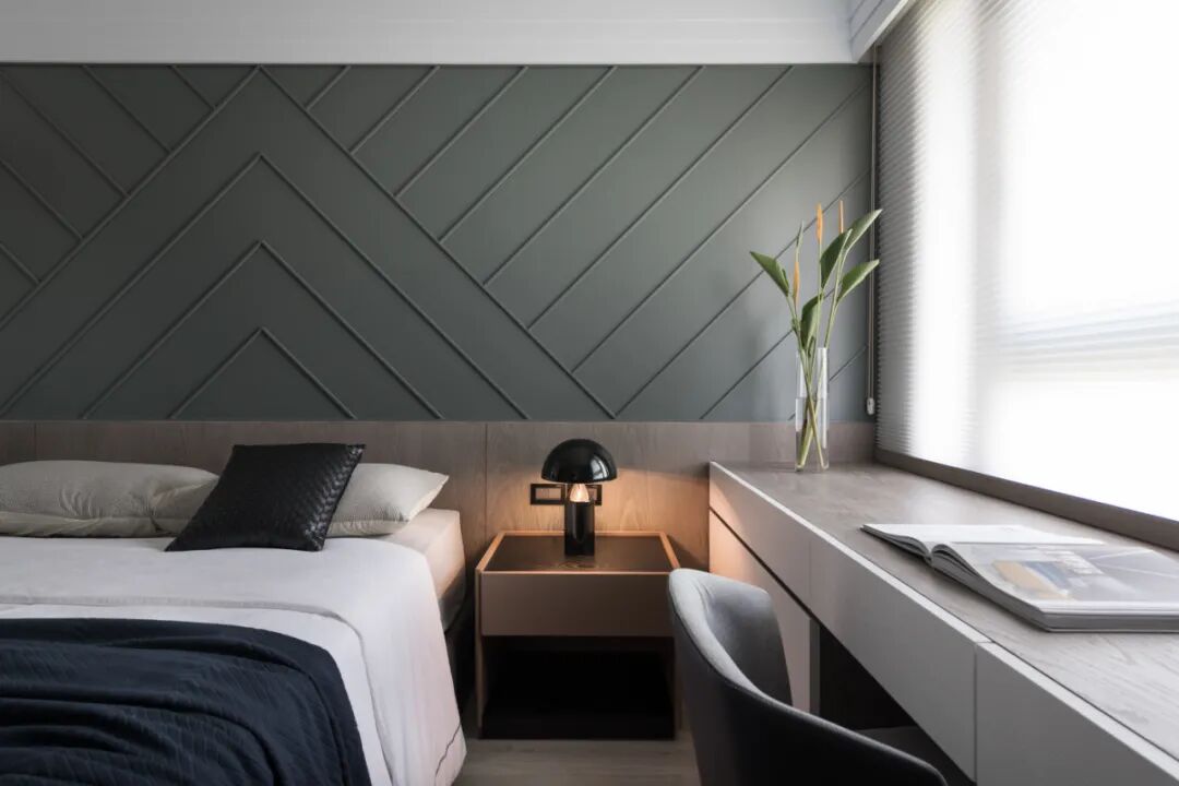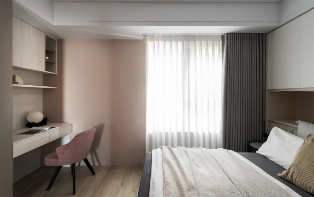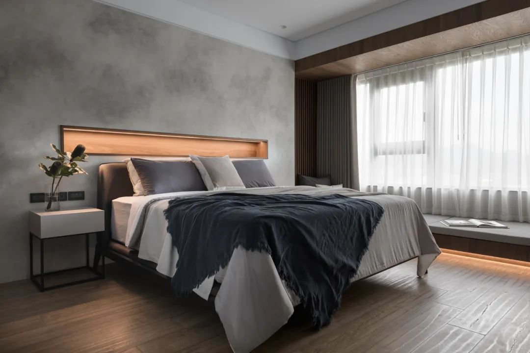 移步卧室,木皮沿着空间轨迹延伸,开启了空间与自然生态的对话,贴合墙面的定制设计,打破了单一化的空间视觉形态,飘窗、衣柜、书桌、墙柜等,展现出强大的多功能系统。