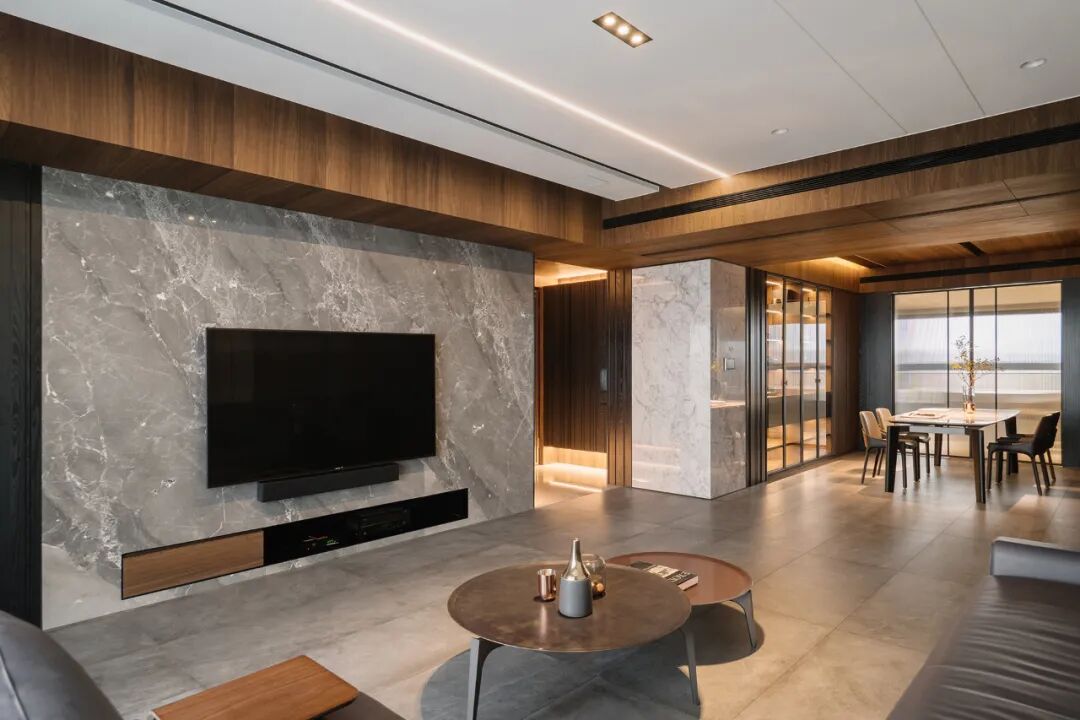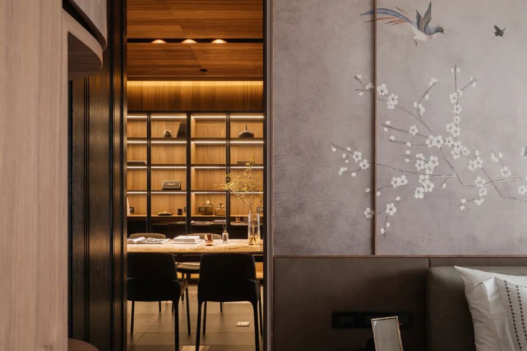 用餐区域,以木皮填充,铺设出简洁有序、细腻优雅的初印象,置入岩板餐桌与皮质餐椅,与灯光调和,让视觉得到丰沛而轻盈的感知。