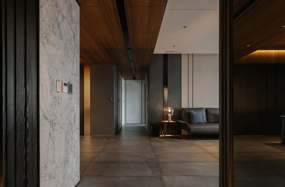 入户空间,以一面到顶的柜体,留下木皮纯粹的本质,呈现理性与温情的碰撞,断绝满墙柜体带来的空间压迫感,忙碌后归家时的疲倦也能被一扫而光。