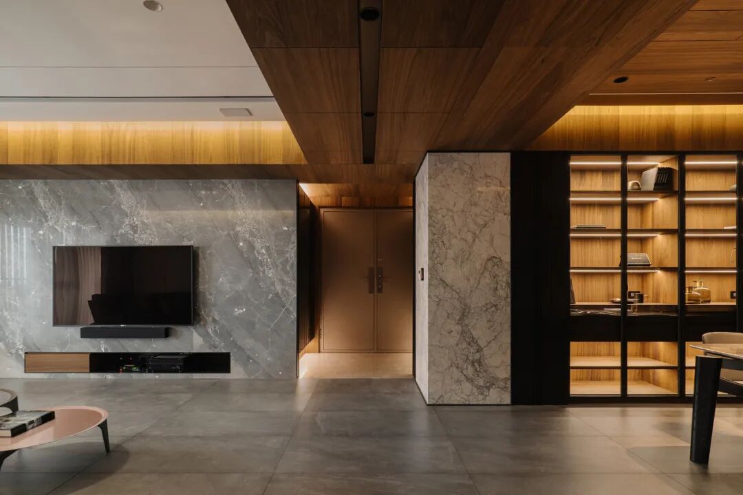 木皮纹理就像空间内那股自由流动的气韵,从护墙到柜体连贯延伸,让自然与生活之美触手可及。